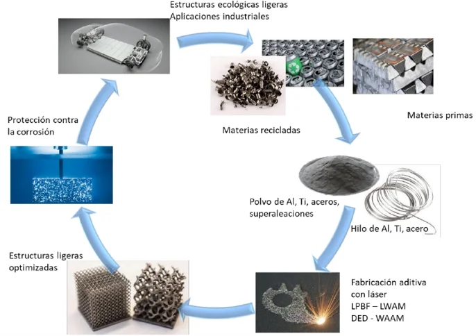 Los objetivos específicos se van a agrupar en torno a tres estrategias que se desarrollarán en paralelo. Todas están enfocadas en reducir el costo y el impacto ambiental de los procesos de fabricación empleando la fabricación aditiva como herramienta fundamental.